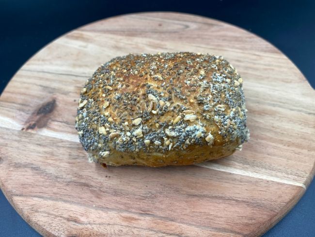 Langtidshævet morgenstykke bagt på hjemmelavet surdej, fransk hvedemel tilsat havreflager, solsikkekerner og hørfrø.